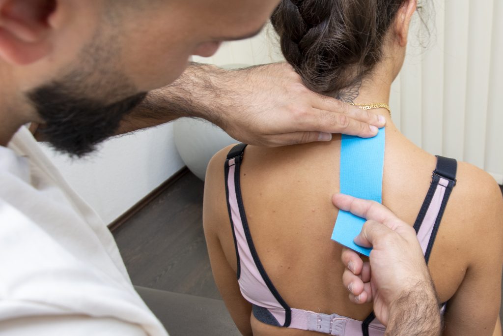 Kinesiotaping ist eine Therapiemethode, bei der elastische Klebebänder auf die Haut aufgebracht werden, um bestimmte Muskel- und Gelenkfunktionen zu unterstützen oder zu verbessern. Diese Methode wird oft verwendet, um Schmerzen zu lindern, die Beweglichkeit zu fördern, die Muskelaktivität zu verbessern und die Heilung bei Verletzungen zu beschleunigen.